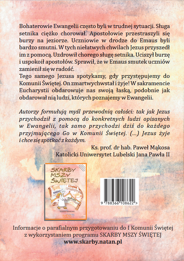 Książeczka jest kolejnym elementem parafialnego programu przygotowania do I Komunii Świętej SKARBY MSZY ŚWIĘTEJ w skład którego wchodzą: Zeszyt dziecka, Podręcznik metodyczny, Katechezy multimedialne. Więcej o programie https://skarby.natan.pl/